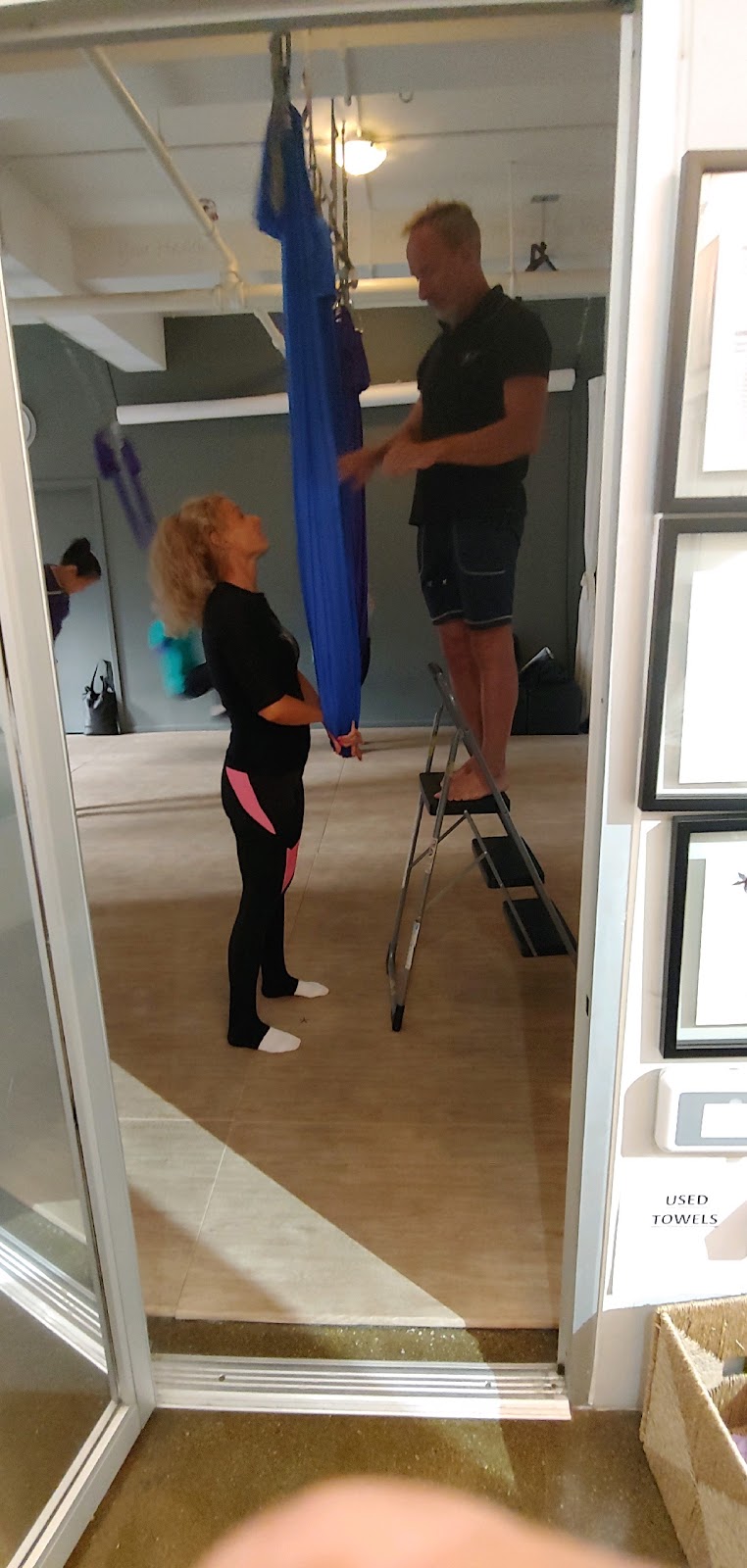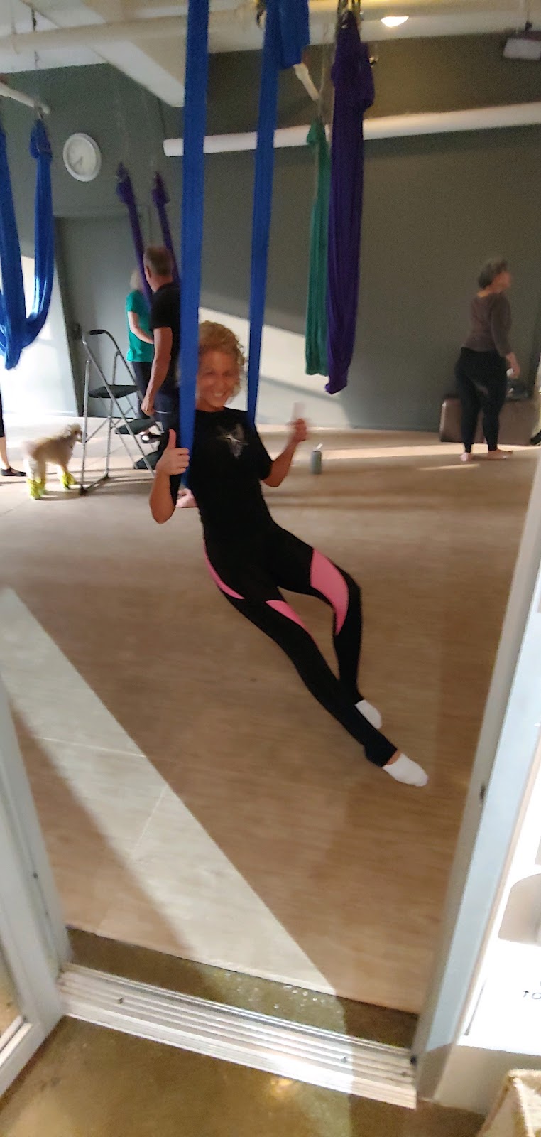 "Christopher is clearly knowledgeable—he mentioned founding anti-gravity yoga and guided us through a well-rounded session that included stretching, strength work, and inversions. However, his humor is a central part of the experience and may not be for everyone. For example, he joked that we had to laugh while swinging or he’d come “tickle” us—but his tone and presence made it feel more like a command than a suggestion. His feedback can also feel insensitive to different abilities and learning styles. A few beginners, who appeared new to anti-gravity yoga and were visibly struggling, was told, “No… no! / Figure it out! / Just try to look like me!”—which didn’t seem supportive, especially as the students looked uncomfortable and didn’t engage with the humor. Photos were also taken on an iPhone (unclear if it belonged to Christopher or the studio) and Airdropped at the end; you can opt out during class if you prefer not to be photographed. Toward the end, the studio’s small dog joined us in a hammock and barked to “help wake us up.” If you have pet allergies, it’s a good idea to call ahead and ask about accommodations. The studio itself is clean, with friendly staff, a water dispenser, and well-maintained changing rooms and restrooms. I would still recommend the studio overall—it has a welcoming atmosphere, and I had a great experience with another instructor. If you’re newer to anti-gravity yoga or prefer a more hands-on, supportive approach with a different teaching style, you might find another instructor at the studio to be a better fit."