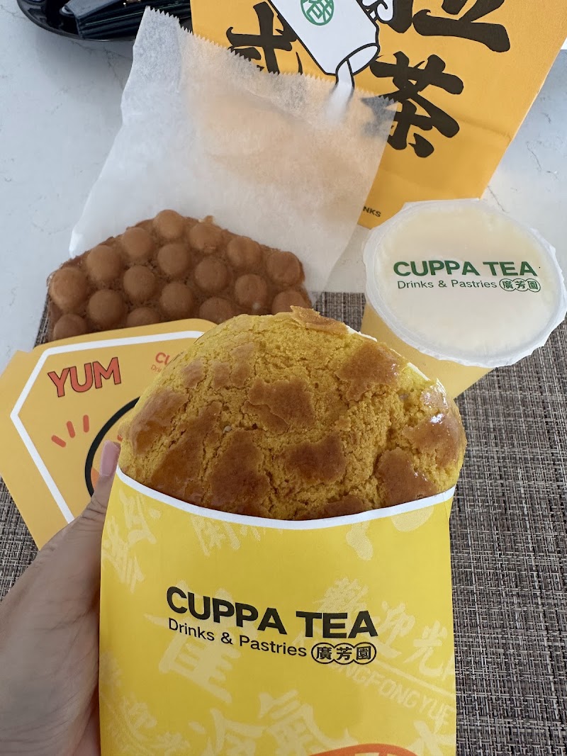 "A small tea cafe good variety of drinks, the pineapple bun and the banana chocolate egg waffle are very good. Very busy"