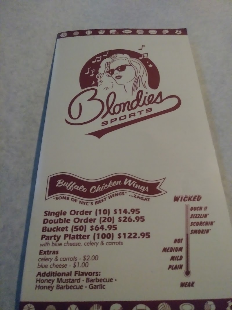 "If my friends and I want to meet up for Buffalo wings in Manhattan, Blondie's is where we go. Some places have a few Buffalo flavors sprinkled among a dozen others; Blondie's really brings you the Buffalo: eight different heat levels. With cold pitchers and good people, what else does a hot wing fan need? I'm told the other food is good too, but I make the pilgrimage for wings."