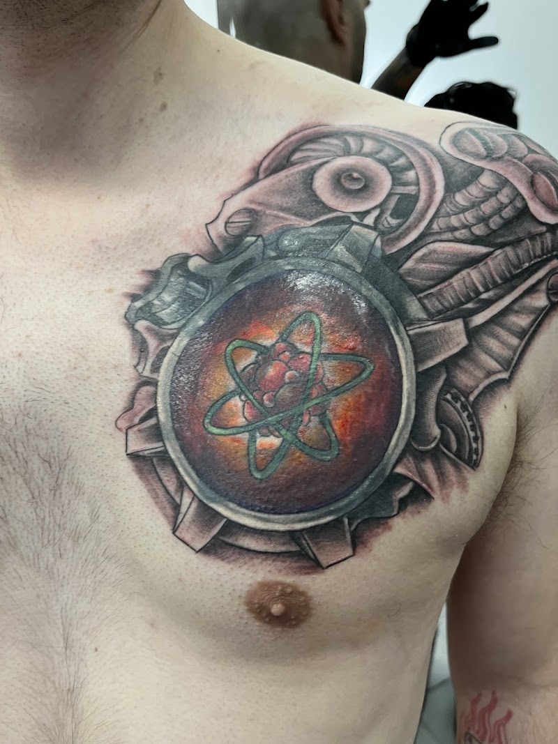 "Shop has been on the same block 10+ years and the skill of the artists shows this. Amazing work. I had a large solid black tattoo on my chest. Melite Valente covered it up with a unique cyberpunk piece. Worth every dollar - and he worked with me on the price. Don’t go anywhere else and thank you to the staff!"