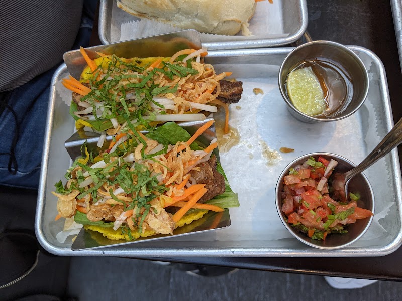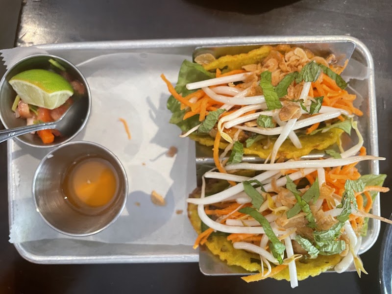 "You really can’t go wrong dining here. The food was consistently solid, and the service was more than acceptable. I also loved the overall vibe—it felt inviting and thoughtfully curated. The menu had a unique Vietnamese twist. I don’t think I’ve ever tried a bánh xèo taco before, so that alone made the experience memorable. That said, while it was definitely tasty, I’m not sure I’d return just for that specific dish. One fun touch: the secret passage to the bathroom was a cool surprise. But sitting right in front of the bathroom door? Not the most pleasant spot."