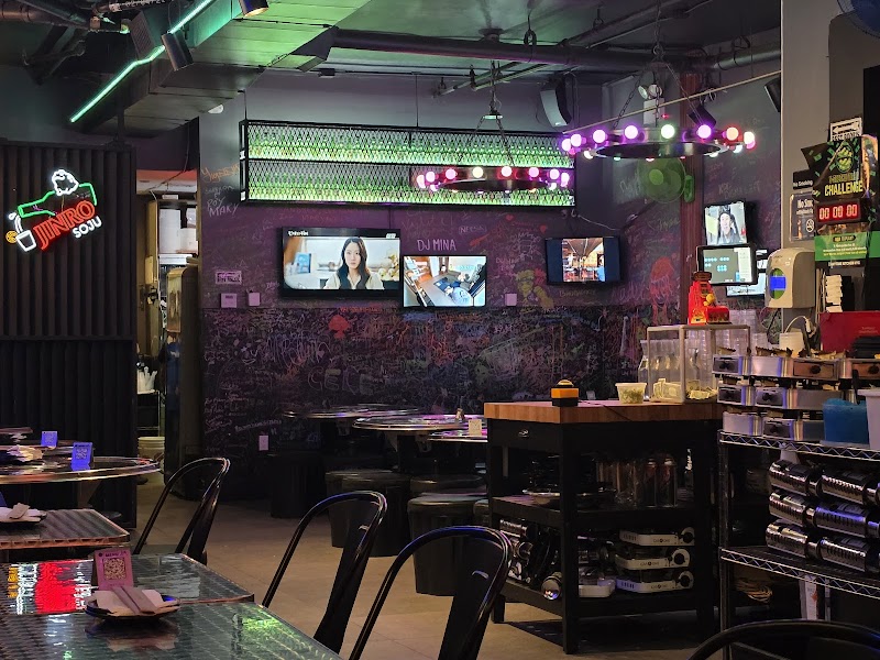 "Stopped by this establishment over the weekend in the evening when we were craving some Korean food. The restaurant is tucked away upstairs from street level and easy to overlook, but signage outside can help you locate it. Upon entry, the atmosphere was inviting with the room dimly lit and cozy. The service itself throughout our meal was fine. We ordered the Truffle Jjajang Ramyun ($18.95), Kimchi Jjigae ($30.95), Street Combo with Katsu ($23.95), Pork Galbi BBQ ($27.95), and a White Peach Cocktail ($17). Everything except the cocktail is pictured below. For a group of six, our bill came to around $150 before tips. Despite the dishes tasting decent, the small portions and steep prices left nothing to write home about. This seems more like a spot to enjoy a drink and a light bite rather than a full dining experience. It’s also worth noting that you get 10% off if you pay with cash. There was a spinning wheel by the reception area, although it appears there's a fee to play. If ambiance and getting a light bite is your priority, this spot could be worth a visit."