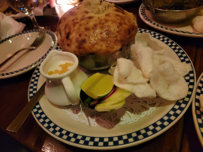 "This is a nice place to go on a date or meet up with friends or family. The ambiance and decor are a bit unique and that is the main attraction here. The service is very good. Staff are attentive and friendly. The food is pretty good. It's not the best Indian I have had. However, it is tasty. They make biriani authentic style with atta sealed on top. It's definitely worth a try!"