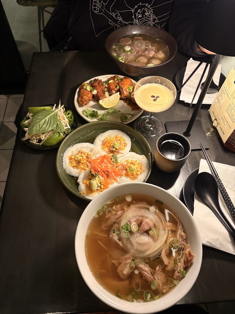 "really delicious, beautifully balanced flavors. I'd recommend everything we got! we got the rice cakes and wings for appetizers. So good. My husband got the espresso martini and classic (beef) pho, and I got the chicken pho. It was perfectly warming on this winter day, the chicken was tender and the broth flavorful. The ambience is really nice as well, beautiful interior, service is excellent and bathroom is clean!"