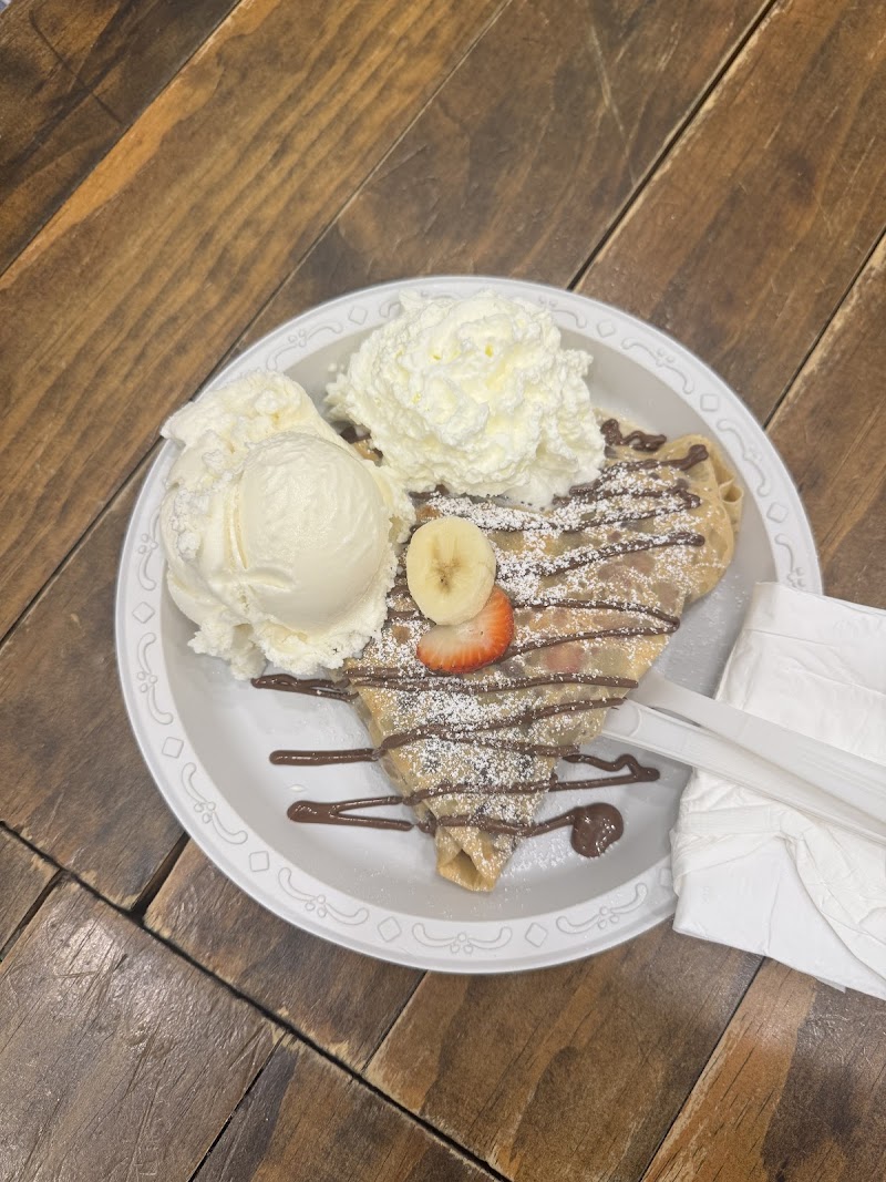 "Minus one star because of slow service. I understand there are many orders and only one person making the crepes. The owner should work on this so they can have quicker service. Minus another star because the seating area indoors was not clean. Had food on the cushions. The staff was friendly with me. Crepes and waffle tasted ok. Give this place a try but order ahead."