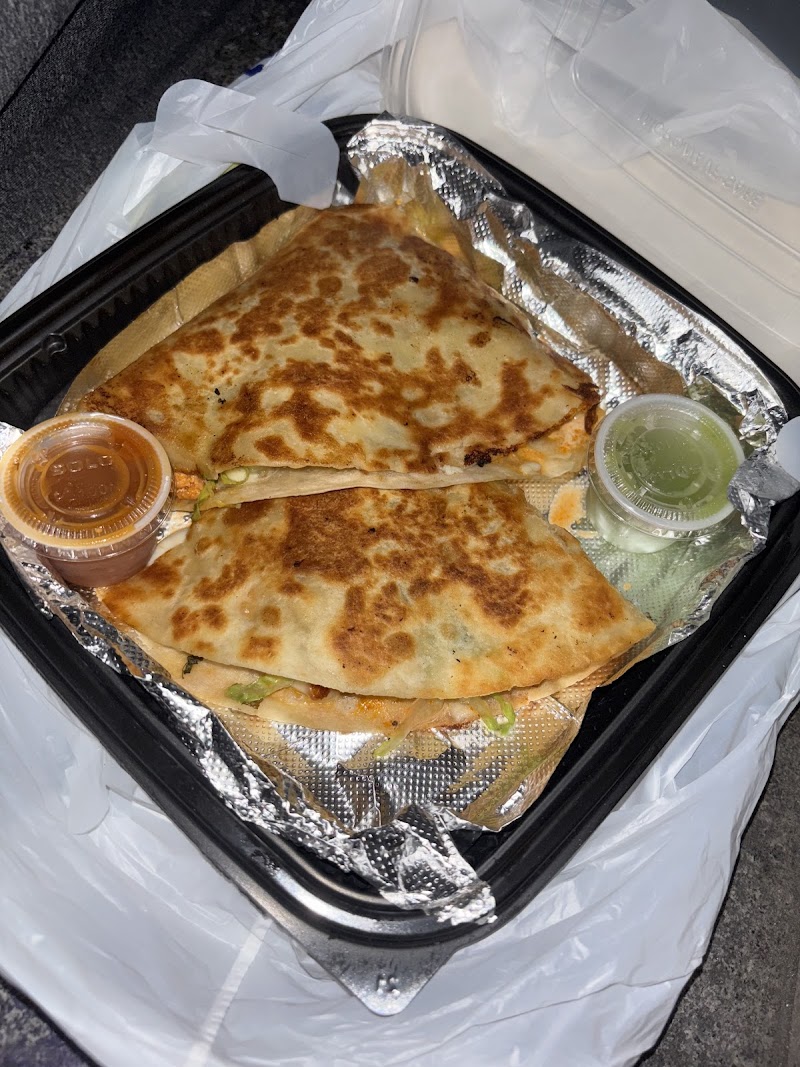 "Definitely one of the best chicken quesadilla I ever had. Was just walking around and found this place. The quesadilla was extremely juicy with a bunch of sauces, and had a nice kick to it. Never had pickles in a quesadilla, so liked that touch of it. The chicken was also tender and plenty. It came with two sauces but I did not get to try them. The quesadillas are huge so that’s sufficient for a meal. There’s a nice public place to sit close to the truck, so there’s some place to sit and eat."