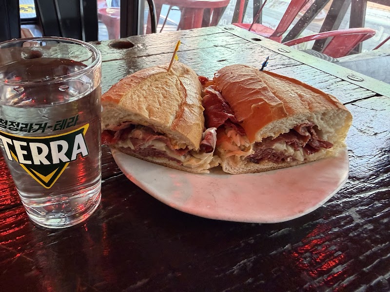 "Stopped by here for lunch recently since I saw the place had such good reviews. I am so glad I gave it a try! My partner and I split a reuben. Unfortunately, they were out of roast beef, so we had it with pastrami. It was still one of the most tasty, juicy (in a good way) sandwiches I've had in a while! The flavor was excellent. The place is really neat inside. It has a front area where you place your order at the counter, with a couple of small tables in front. After ordering, you can go to the back room, where it is small, dimly lit, and full of neat music related decor. We really enjoyed this place. Highly recommend!"