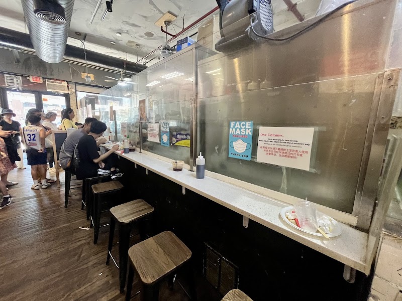 "This place is overrated. It’s the Flushing location. The space is so small. They have the first shop location in this small food court/hall, so they attract all the customers. The vendors in the back are so bored that they’re on their phones. There is limited counter seating, and when people walk past you, it’s easy to get bumped. It’s not a comfortable eating situation for a big group for sure. I got the soy milk, and it was good. They have condiments, like soy sauce and chili sauce. No bathroom."