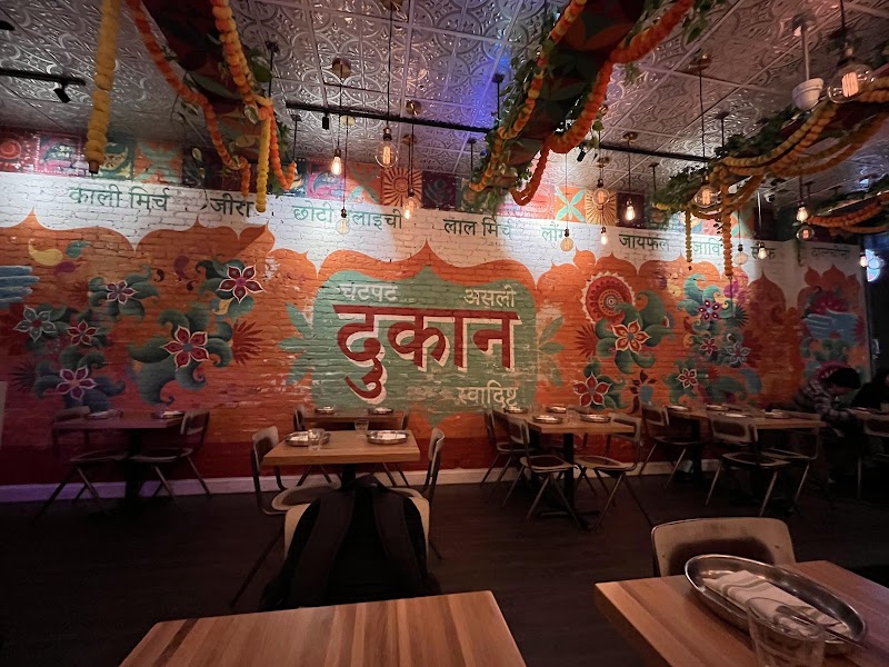 "Outstanding experience. Our waitress, Sara, was extremely helpful, telling us spice levels, what went well with certain dishes, and just extremely kind and pleasant. We ordered phuchka, cauliflower fritters, and the fish fry for appetizer. The fish was so good, not your average fried piece of fish, served with a house made mustard. Braised goat for entree with delicious and perfect amount of heat, we ordered fried bread with it. Dessert we had a cottage cheese/cheesecake that was super freaking after our meal. Also we each had a cocktail that were both tasty and absolutely unique. If you ever wanted to impress someone with Indian food, you’d take them here. Interior…cozy, fun and beautifully decorated."