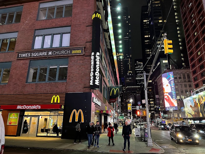 "Clean and nice inviting atmosphere at this McD's location in the heart of the Theatre District. Didn't know they had two options for pies which included their original apple and now blueberry pie. Get a break when you buy a pair."