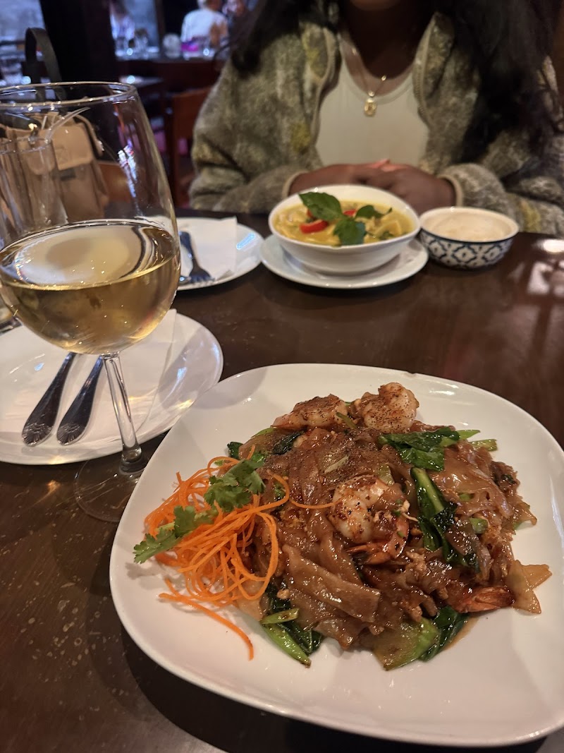 "Went here on a quiet Wednesday afternoon for a solo date after some shopping. The place was very nice, good music, calm vibes. Truly beautiful space. The serving staff was so sweet and attentive! I got their lunch special pad see ew with chicken and pork dumplings added on for 3+ dollars and it was amazing. They also had happy hour! So I got a mango and ginger Margarita that was perfect amount of strong and sweet. The ginger added an AMAZING kick. Over all amazing meal, amazing place and would most definitely be back again!"