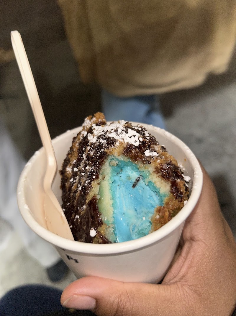 "Delicious and wonderful different take on ice cream, but the shop is only open on Fri, Sat and Sun. The basic fried ice cream is a really big scoop of fried ice cream with a drizzle for $7 where you have 9 flavors (including 2 vegan, $1 extra), 4 crust and drizzle options. They also have 6 different toppings options for an extra 50 cents. They also sell just ice cream by scoop. We had the blueberry cheesecake ice cream and strawberry ice cream with regular bread crust and both of them were really good. The ice cream scoop is first dipped in a thick sweet batter and then crusted and fried in oil. The heat from the frying makes a nice temperature variation as you cut into it which is quite enjoyable and unique. The crust is thick enough that no oil enters the ice cream, keeping it delightfully great."