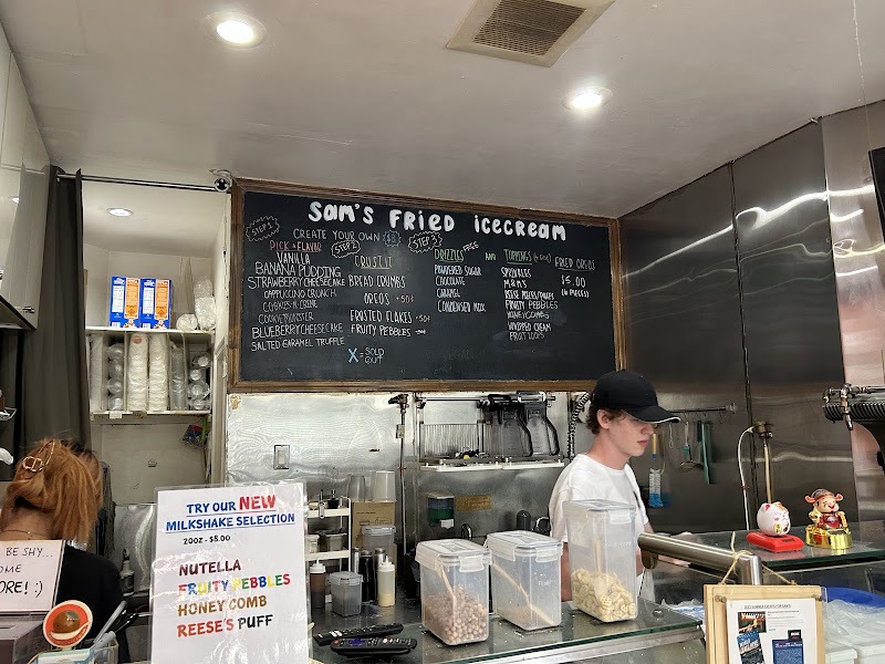 "Quite expensive for a little cup of fried ice cream and for how simple it is. They said they were out of chocolate but didn’t mark it on the board. An extra $1 for toppings is a little expensive in my opinion, but it is NYC so that’s expected. I ordered the cookies and cream with fruity pebbles and condensed milk. Seeing the drizzle of condensed milk they gave me I just had to laugh at how little they put on. But the breading is delicious and adds a nice flavor and texture with the ice cream. The ice cream stays cold even though it’s fried. The other people I went with were anticipating chocolate, so they were disappointed. They stuck with salted caramel and condensed milk which was simple. Then cookies and cream with powdered sugar. The powdered sugar was a late addition while he was putting it in the computer. When we received the ice cream they forgot the powdered sugar. Overall yummy and a nice sweet treat when walked around Chinatown. But I think there are better dessert places. Inside is small with seating. Their cooking area and everything is entirely behind the front counter. It’s cool to see them make it. Employees were friendly and nice."