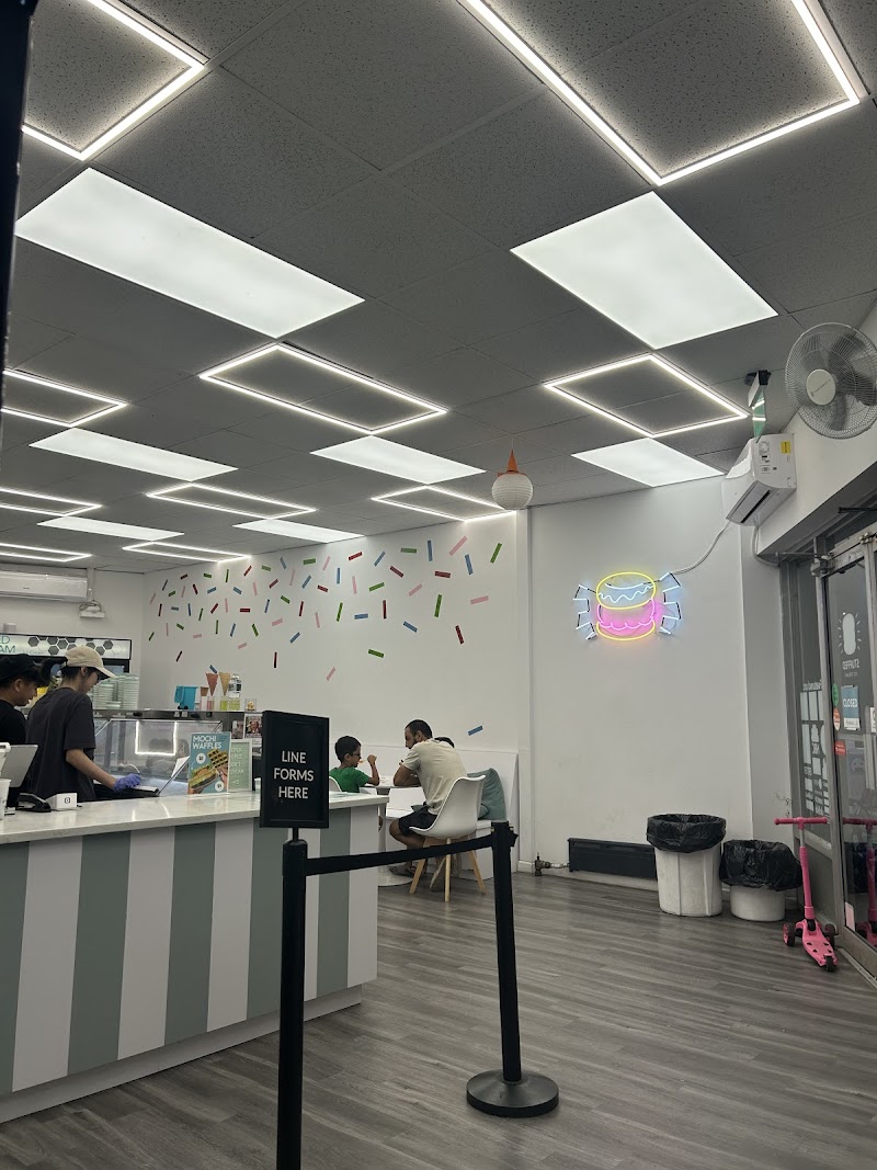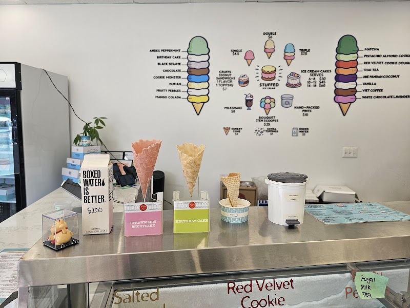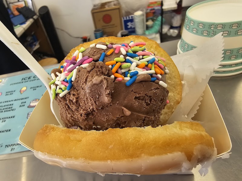 "Came across this cool ice-cream shop while driving. We were immediately drawn to the name of the place. As soon as we walked in, we were greeted. Inside is nice and bright and very spacious. I loved the decor of this place. There are two areas for you to sit and enjoy your ice cream. There are plenty of interesting ice-cream flavors to choose from. The worker at this place let us sample any ice cream we wanted to try. The worker was super friendly and patient. Of course, we ordered the stuff ice cream. Which is ice cream placed in between a donut. They use a glazed donut and slice it right down the middle and put the ice cream in between the donut with any toppings you may want. The ice cream is delicious, but the glazed donut itself is delicious. The donut is nice and fresh. I sampled the red velvet ice cream that was delicious. The cones look really good as well. There are plenty of ice-cream options here, from flavors, different cone options, milkshakes, ice-cream cakes, and plenty of toppings. This place is great for adults and for family outings with the kids. Overall, I had an amazing experience here. Friendly and helpful staff and the place is kept clean. I will definitely be returning."